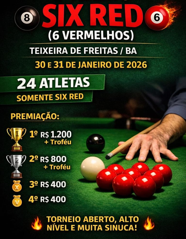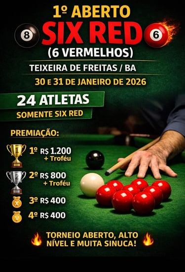 A cidade de Teixeira de Freitas (BA) será palco de um grande evento esportivo neste fim de semana com a realização do 1º Aberto Six Red (6 Vermelhos), um torneio de sinuca que promete alto nível técnico e muita emoção para os amantes do esporte.